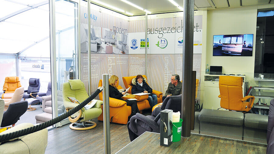 In Kooperation mit himolla präsentieren wir Ihnen den einzigartigen Wellness-Truck, Europas größtes mobiles Enspannungsmöbel-Studio. Der Truck verfügt über eine 100 qm große Kompetenzfläche rund um Ruhesessel und Komfort-Sofa. Zerostress-Ruhesessel sind z.B. nach den neuesten ergonomischen Richtlinien zur anatomischen Unterstützung der Wirbelsäule ausgestattet, fein abgestimmte Bewegungsabläufe erhöhen das Wohlbefinden und sorgen für optimale Entspannung von Wirbelsäule, Nacken- und Lendenpartie.